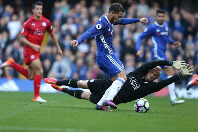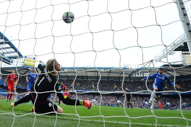 Aos 32, após enfiada de Matic, a bola rebate de forma estranha na zaga do Leicester, no Pedro, e acaba sobrando para Hazard, cara-a-cara com Schmeichel. Foi só o belga fintar o goleiro para anotar o segundo gol na conta dos Blues.