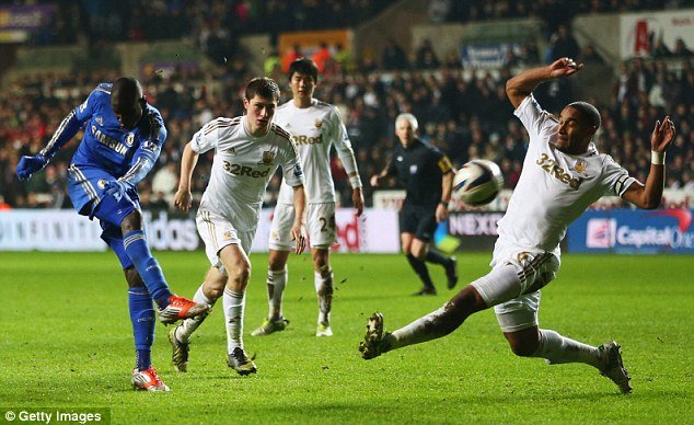 O técnico Michael Laudrup resolveu então gastar a sua primeira substituição no jogo e colocou o meia Nathan Dyer no lugar de Wayne Routledge. Logo em seguida, Rafa Benítez também aproveitou para mexer: Ivanovic deu lugar a David Luiz. Aos 27, tabela entre Mata e Ba: o espanhol tocou para o senegalês e recebeu em seguida para mandar para o gol de Tremmel, que caiu e encaixou.